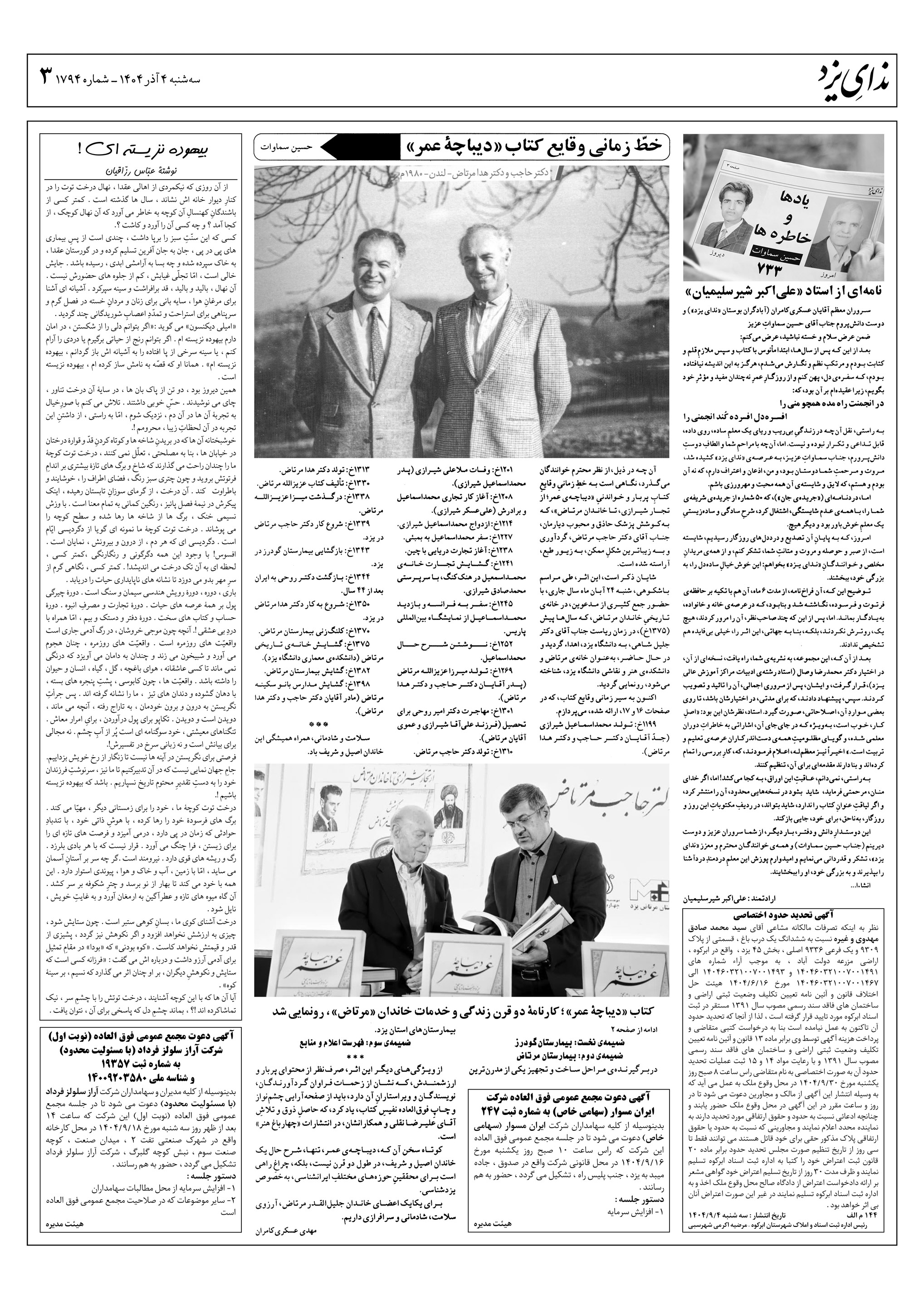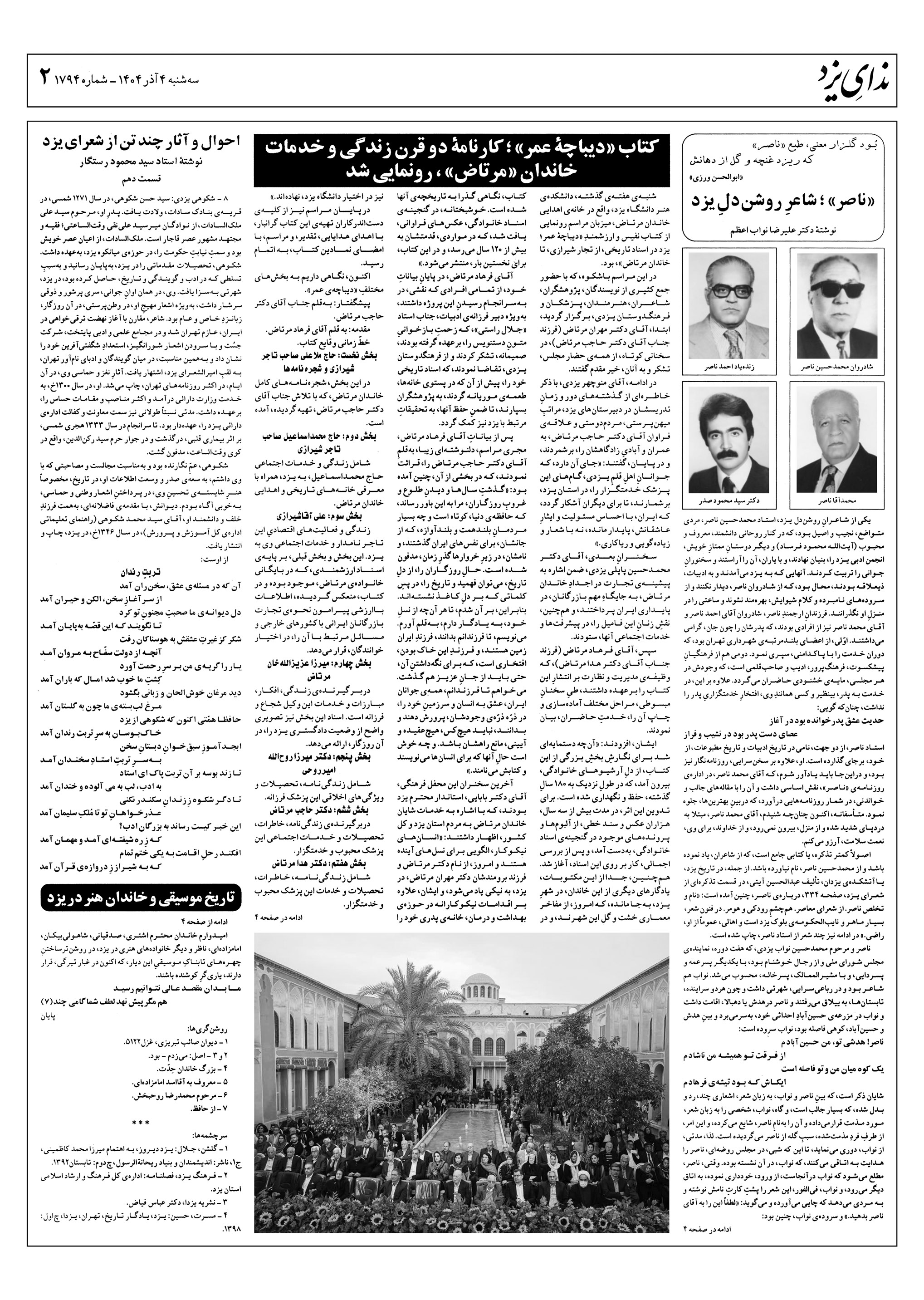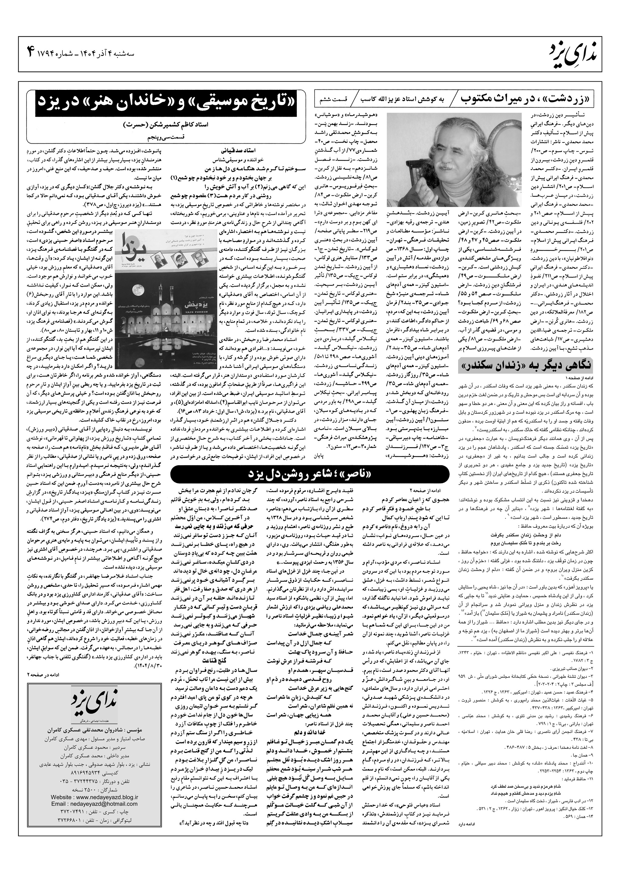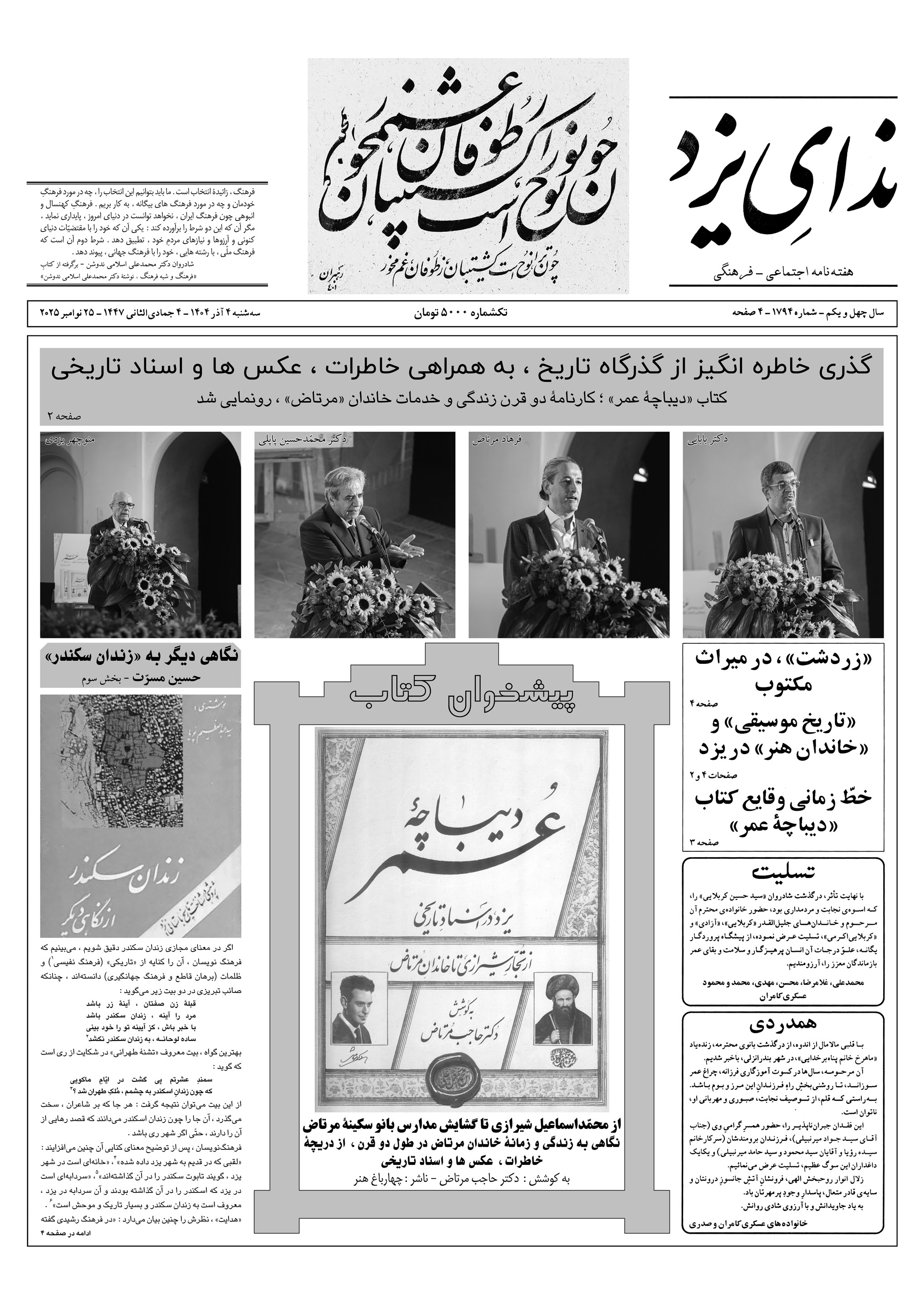 هفته نامه ندای یزد شماره 1794 مورخ سه شنبه چهارم آذر 1404